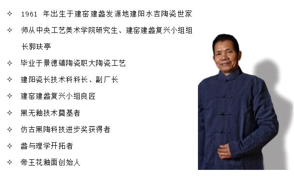 由于父母都是建阳瓷厂的员工,我从小也生活在瓷厂,在这种潜移默化的影响下,慢慢 的接触了陶瓷工艺,在建盏复原小组成立前,瓷厂的生产内容主要是日用白瓷。后来响应国家的号召,在复原小组组长郭玞亭的主持下,成立了建盏复原小组,很荣幸,我也参与了复 原小组的工作,并且得到了郭老师的认可,并且十分荣幸的拜在郭老师门下,成为郭老师的 徒弟!