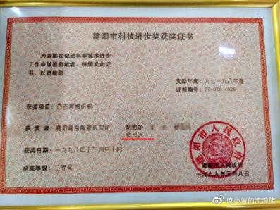 仿古黑陶,烧制难度大,因为能够交流的人少之又少,懂这方便的人也是凤毛麟角。再 加上市场需求量不多,所以,再那个年代通过烧盏来维持生计是十分困难的,都是熬过来的。 政府也为了鼓励我们的成果,所以给我们颁发了这个科技进步奖。当时没有一等奖,我们是 获得了二等奖,这份荣誉,对我们来讲,确实意义非凡,在精神上给了我们很大的鼓舞,让我们有了坚持的信心。